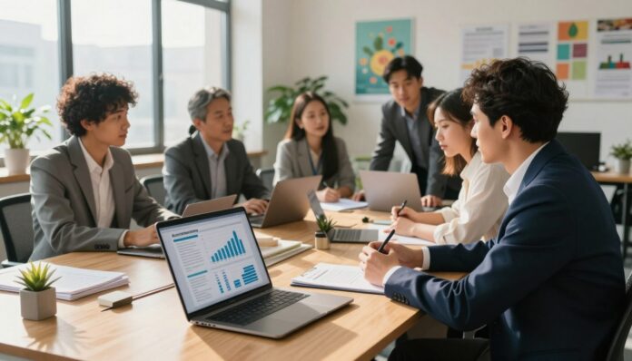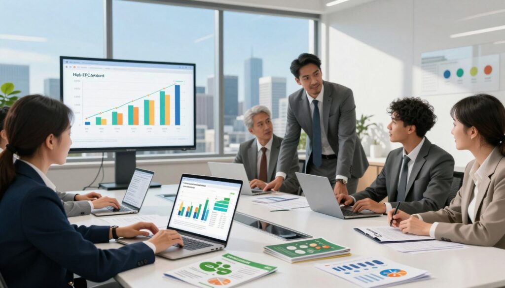 A modern office setting filled with vibrant elements representing high-EPC affiliate categories in health. In the foreground, a diverse group of professionals in business attire are engaged in a discussion, surrounded by digital devices displaying graphs and charts indicating strong payout performance. The middle ground features a sleek conference table adorned with health-related brochures and data reports, emphasizing the growing sectors of wellness, fitness, and supplements. In the background, a large window reveals a bright city skyline under a clear blue sky, symbolizing opportunity and growth. Soft, natural lighting streams in, creating an optimistic and collaborative atmosphere. The angle captures the dynamic interactions among the professionals, highlighting innovation and successful partnerships in the health affiliate market.