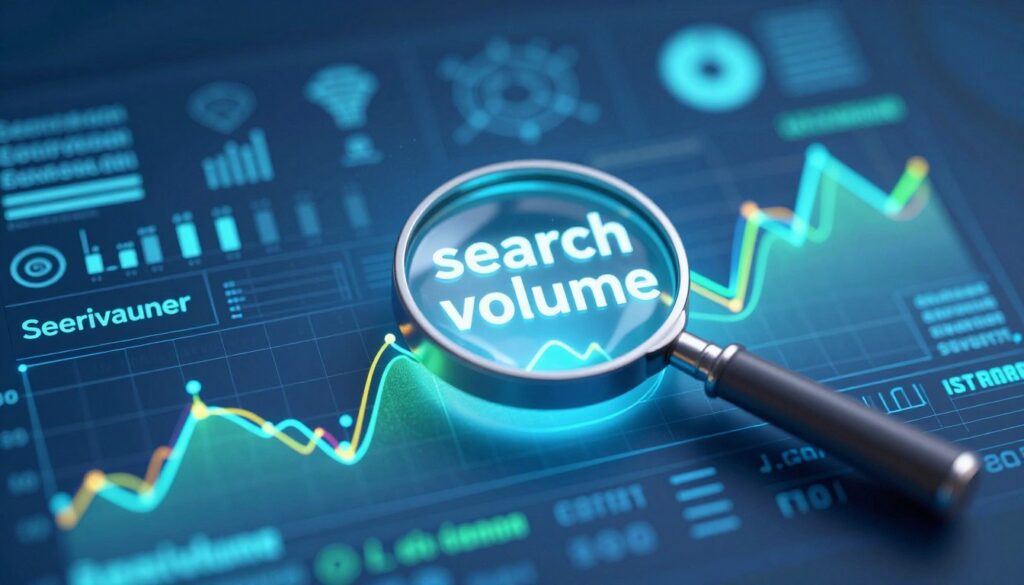 A stylized digital illustration depicting the concept of "search volume." In the foreground, a large, glowing magnifying glass hovers over a colorful, dynamic wave chart representing search trends. The middle ground features a variety of data points and graphs, displaying keywords in different sizes to symbolize their search volume and related difficulty. The background showcases an abstract digital landscape with symbols of various search engines and databases in soft focus, enhancing the theme of online research. The scene is illuminated with cool blue and green lighting, creating a modern, tech-savvy atmosphere. Capture a sense of clarity and exploration, as if discovering valuable insights into keyword analytics. The angle is slightly elevated, offering a comprehensive view of the interconnectedness of data. No text or watermarks are included.