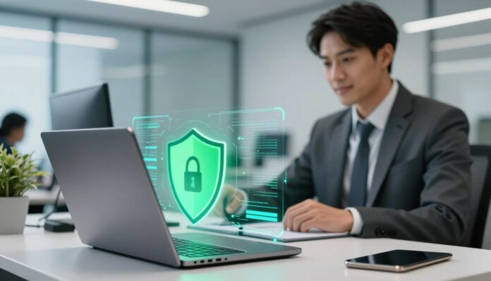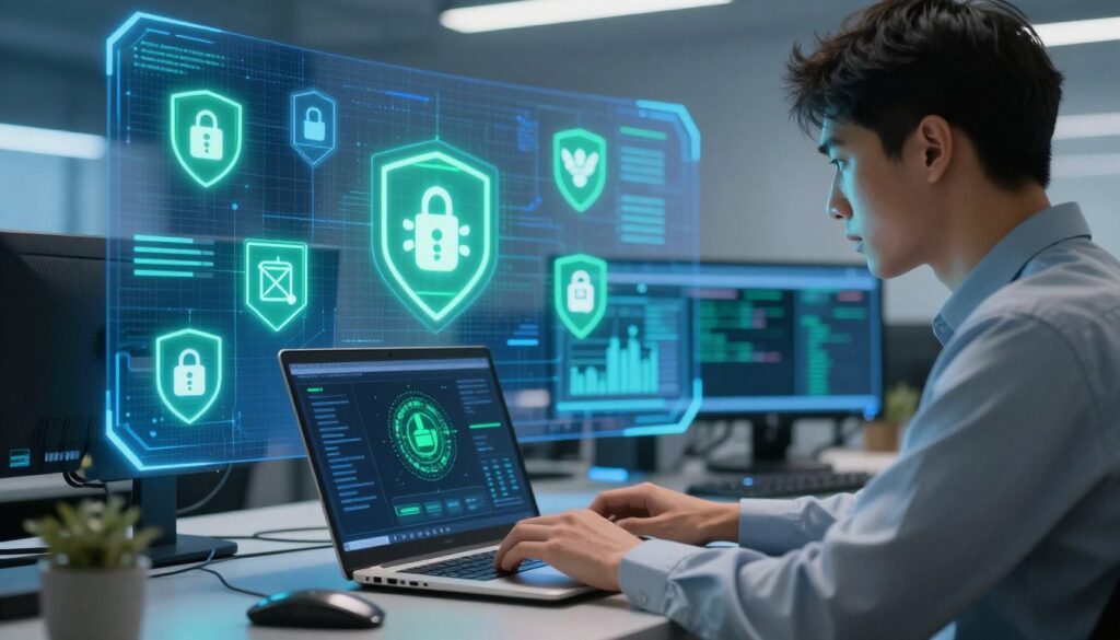 A modern cybersecurity scene depicting malware protection in action. In the foreground, a focused IT professional in a smart business outfit analyzes a laptop with advanced security software open on the screen, featuring visual indicators of detection and prevention. The middle ground showcases a digital interface with glowing icons representing various malware threats being neutralized, layered over a deep blue matrix background. In the background, abstract representations of firewalls and antivirus shields create a sense of layers and defense. The lighting is bright and high-tech, with soft blue and green hues illuminating the scene, evoking a sense of security and vigilance. The atmosphere should feel professional and reassuring, underscoring the importance of protecting one's digital life.