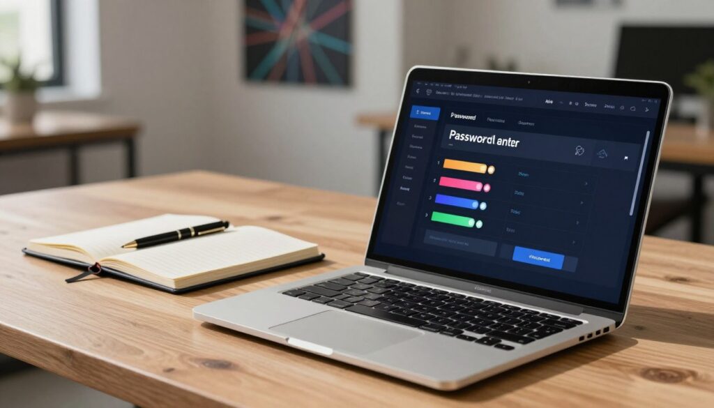 A visually engaging scene of a digital password generator interface displayed on a sleek laptop, situated on a modern wooden desk. The foreground features a close-up of the laptop screen, showcasing an intricate and visually appealing password generation tool with colorful password indicators. In the middle ground, an open notebook and a stylish pen hint at brainstorming password strategies. The background includes a softly blurred view of a contemporary office environment with walls adorned in subtle tech-themed art. The lighting is bright and inviting, highlighting the productive atmosphere while casting soft shadows. The overall mood conveys a sense of urgency and importance in safeguarding online security, emphasizing the significance of strong passwords right now.